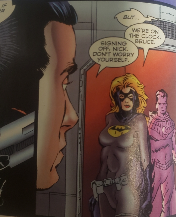 So you may be thinking this would be just Batgirl/woman, no? But no this is a blended world people. This is Barbara Gordon Hardy, the Black Bat. A mixture of Batgirl x Black Cat, who is also an agent of S.H.E.I.L.D. as well.I actually didn’t catch the blend of who she was at first, but the name give it way. Black cat’s name is Felicia Hardy. Did I mention she’s dating Bruce.